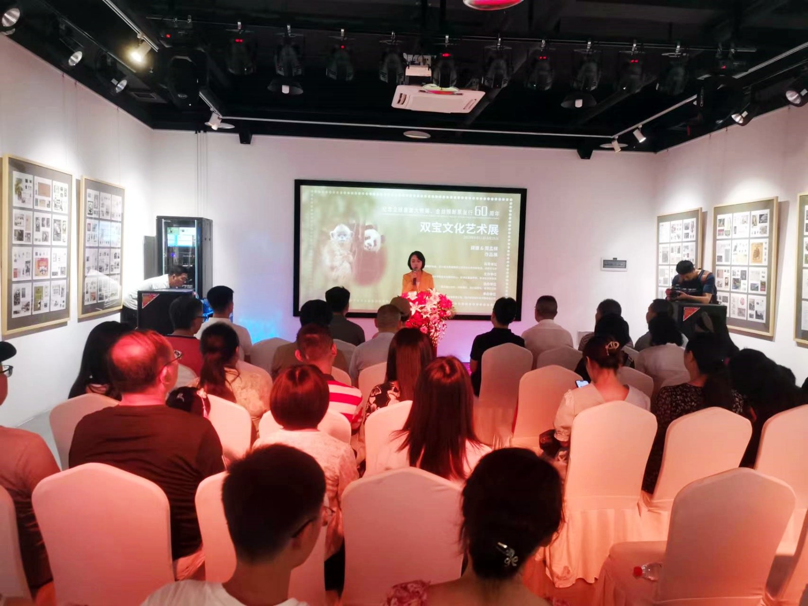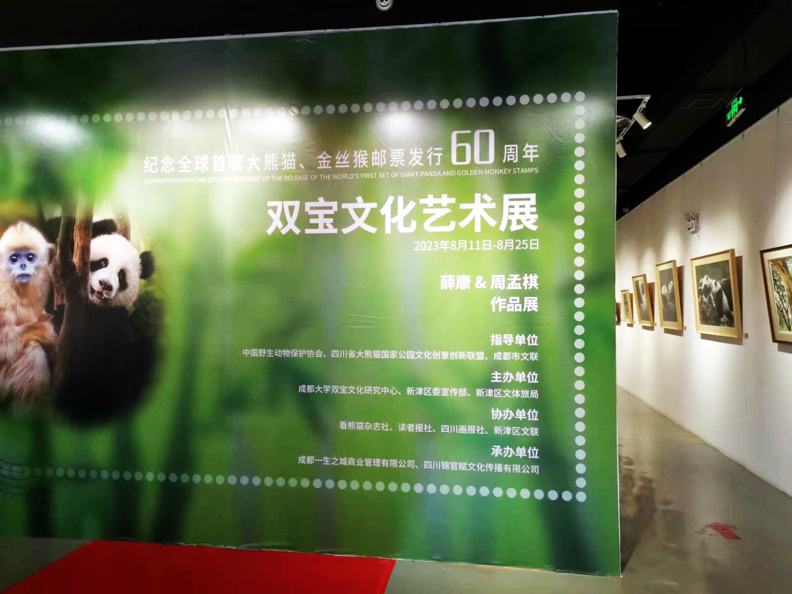 8月11日下午,为提升大众的野生动物保护意识,构建多样性的生态环境,践行“绿水青山就是金山银山”的生态理念,“纪念全球首套大熊猫、金丝猴邮票发行60周年暨双宝文化艺术展——薛康&周孟棋作品展”在成都市新津区老码头步行街艺术馆开幕。此次展览由中国野生动物保护协会、四川省大熊猫国家公园文化创意创新联盟、成都市文联指导,成都大学双宝文化研究中心、中共新津区委宣传部、新津区文体旅局主办,看熊猫杂志社、读者报社、四川画报社、新津区文联、新津区邮政分公司协办。成都市文联秘书长唐学深,四川省大熊猫国家公园文化创意创新联盟秘书长杨蛟,中华全国集邮联合会青少委副主任谢滨,成都市新津区人大常委会副主任杨宽熬,新津区政协副主席高翔,中共新津区委宣传部常务副部长、新津区融媒体中心主任任武,新津区文体旅局局长唐诗,新津区文联主席蔡光根,以及中国生态文明奖先进个人、中华全国集邮联合会副会长、成都大学双宝文化研究中心主任薛康等嘉宾到场参加开幕式。